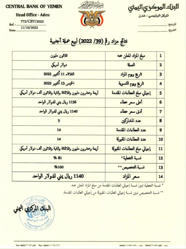 أعلن البنك المركزي اليمني اليوم الثلاثاء الموافق 11 أكتوبر 2022م، عن نتائج المزاد الجديد الذي حمل رقم (39-2022) لبيع عملة أجنبية، والتي أعلن عنها يوم الأحد الماضي.