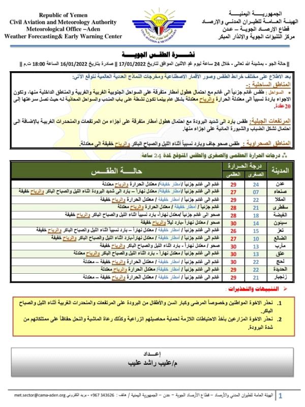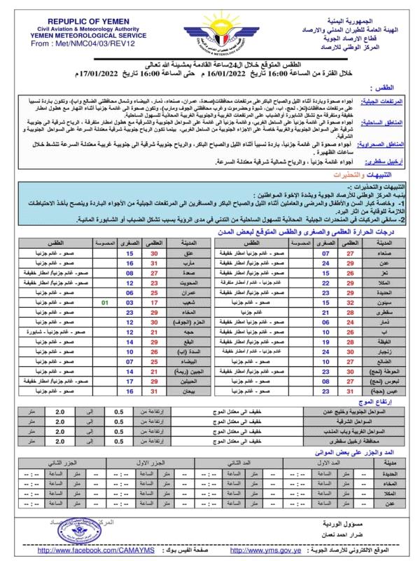 وتوقعت الارصاد اليمنية ان تشهد المرتفعات الجبلية أجواء صحوة وباردة أثناء الليل والصباح الباكرعلى مرتفعات محافظات(صعدة، عمران، صنعاء، ذمار، البيضاء وشمال محافظتي الضالع واب)، وتكون باردة نسبياً على مرتفعات محافظات(تعز، لحج، اب، ابين، شبوة وحضرموت وغرب محافظتي الجوف ومارب)، وتكون صحوة الى غائمة جزئياً أثناء النهار مع هطول امطار خفيفة ومتفرقة مع تشكل الشابورة أوالضباب على المرتفعات الغربية والجنوبية الغربية المحاذية للسهول الساحلية.