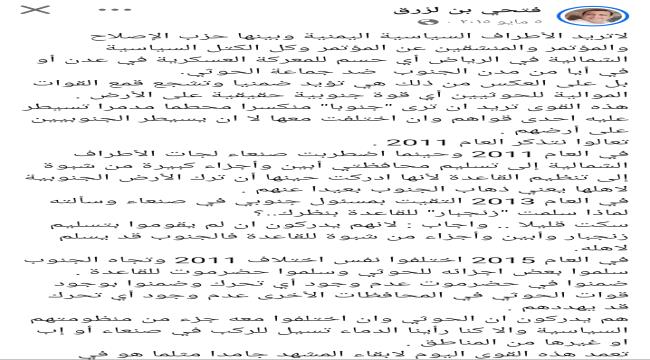 لاتريد الأطراف السياسية اليمنية وبينها حزب الإصلاح والمؤتمر والمنشقين عن المؤتمر وكل الكتل السياسية الشمالية في الرياض أي حسم للمعركة العسكرية في عدن ...