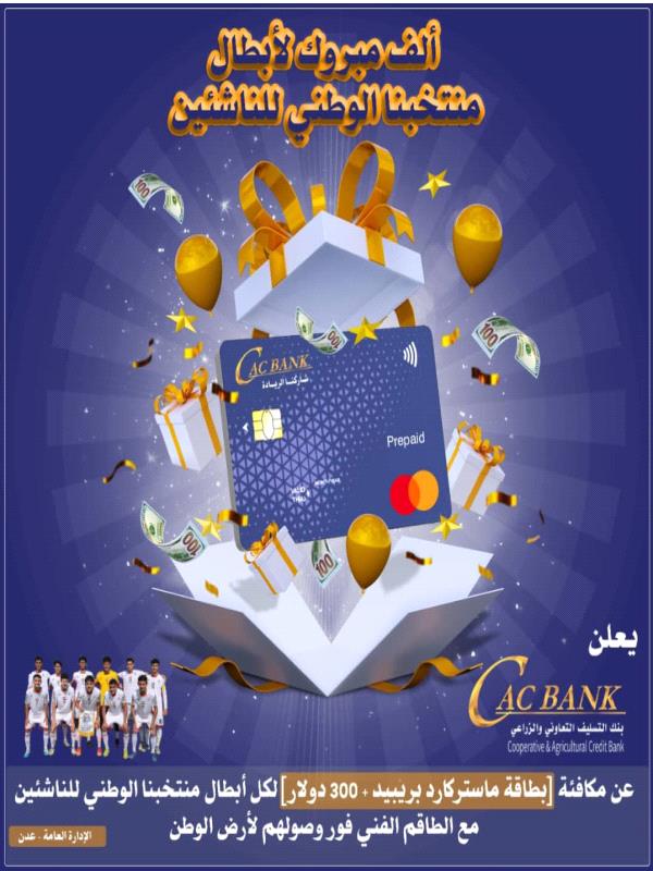 ويعلن بنك التسليف التعاوني الزراعي (كاك بنك) عن مكافأة لكافة اللاعبين وأعضاء البعثة والجهاز الفني ومنح كل منهم (بطاقة ماستر كارد بربيد 300 دولار) تقديرا لهذا الإنجاز الرياضي الوطني المشرف.