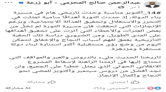 وفي منشور له على صفحته الرسمية على مواقع التواصل الاجتماعي، بمناسبة الذكرى الـ62 لثورة الـ14 من أكتوبر المجيدة، أشار القائد المحرّمي إلى أنه "برغم الإنجازات التي تحققت فإن مسيرة الثورة لم تخلُ من بعض العثرات والأخطاء التي أثرت على تحقيق أهدافها على المدى الطويل".