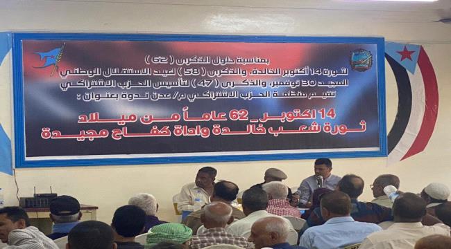 أحيت منظمة الحزب الاشتراكي م/عدن الذكرى الـ 62 لثورة الرابع عشر من أكتوبر المجيدة والذكرى الـ47 لتأسيس الحزب الاشتراكي، والذكرى الـ 58 لعيد الاستقلال الوطني الثلاثين من نوفمبر بإقامة ندوة سياسية شاركت فيها نخبة من أعضاء وقيادات الحزب الاشتراكي وفي طليعة الحضور الرفيق المناضل عبدالواحد المرادي عضو المكتب السياسي للحزب، والرفيق المناضل فضل الجعدي نائب رئيس اللجنة المركزية للحزب، وجمع من أعضاء اللجنة المركزية وقيادات الحزب الاشتراكي بعدن، وضيوف مستقلين، ومن مختلف الانتماءات السياسية والنقابية.
