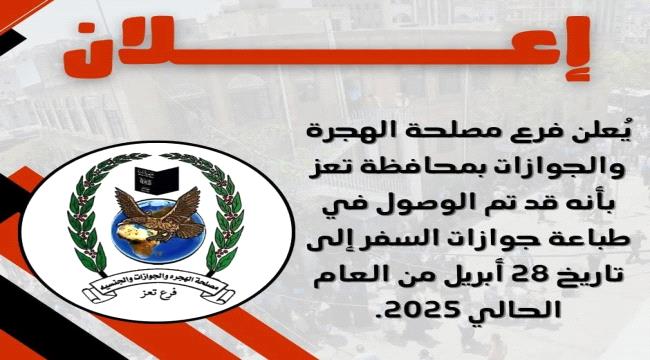 بعد فترة توقف مؤقتة بسبب أزمة الدفاتر، أعلنت مصلحة الجوازات بمحافظة تعز استئناف طباعة جوازات السفر للمواطنين، مؤكدة أن العمل عاد بوتيرة عالية، وأن الطباعة وصلت حاليًا إلى معاملات المواطنين حتى نهاية شهر أبريل 2025م.