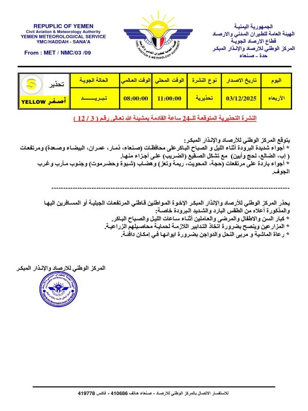وتوقع المركز أجواء شديدة البرودة أثناء الليل والصباح الباكر في محافظات صنعاء، ذمار، عمران، البيضاء وصعدة ومرتفعات إب، الضالع، لحج وأبين مع تشكل الصقيع (الضريب) على أجزاء منها.