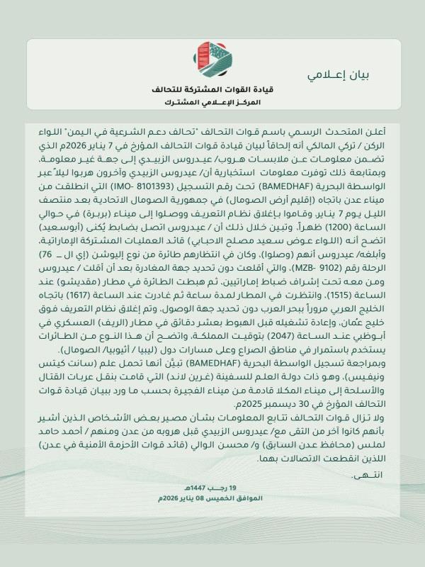 أعلن المتحدث الرسمي باسم قوات التحالف "تحالف دعم الشرعية في اليمن" اللواء الركن / تركي المالكي أنه إلحاقاً لبيان قيادة قوات التحالف المؤرخ في 7 يناير 2026م الذي تضمن معلومات عن ملابسات هروب/ عيدروس الزبيدي إلى جهة غير معلومة،