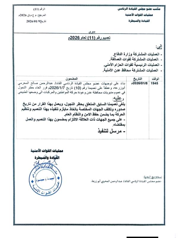 يأتي هذا القرار في ظل استقرار الحالة الأمنية التي تشهدها العاصمة عدن، وتعزيزاً لجهود تطبيع الأوضاع الخدمية والمعيشية، مع التزام الأجهزة الأمنية بمواصلة مهامها في حماية السكينة العامة وصون الاستقرار المنشود.