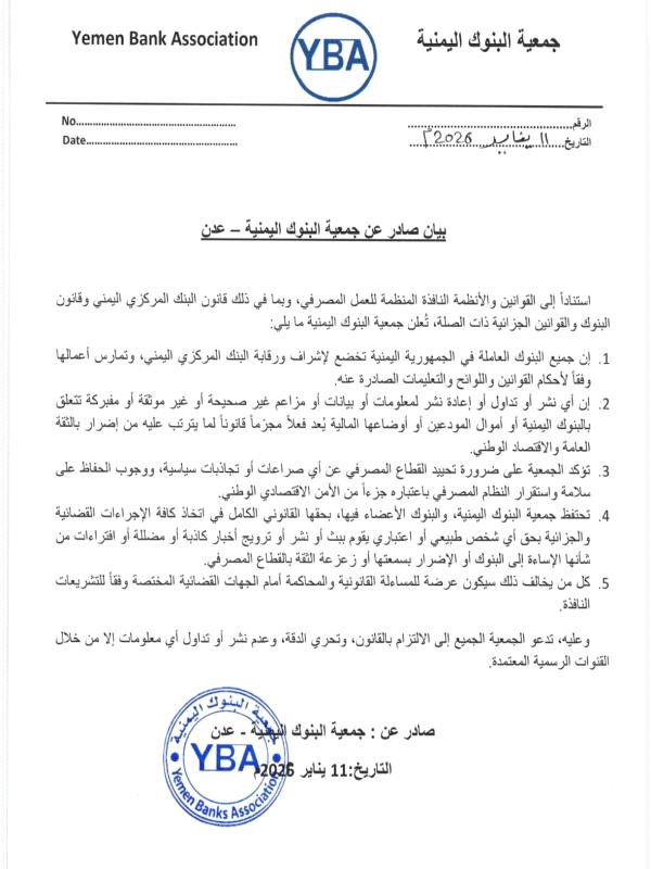 استناداً إلى القوانين والأنظمة النافذة المنظمة للعمل المصرفي، وبما في ذلك قانون البنك المركزي اليمني وقانون البنوك والقوانين الجزائية ذات الصلة، تُعلن جمعية البنوك اليمنية ما يلي: