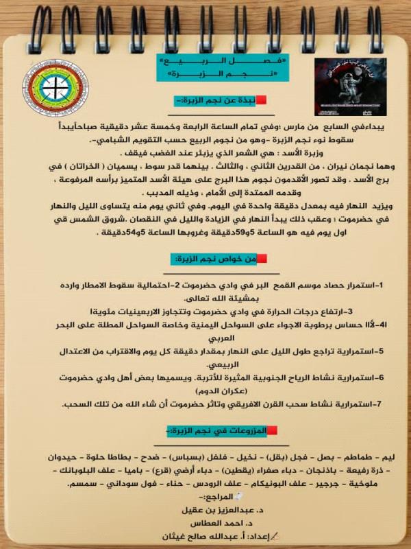يبدأ في السابع من مارس ؛وفي تمام الساعة الرابعة وخمسة عشر دقيقية صباحاًيبدأ سقوط نوء نجم الزبرة -وهو من نجوم الربيع حسب التقويم الشبامي-.