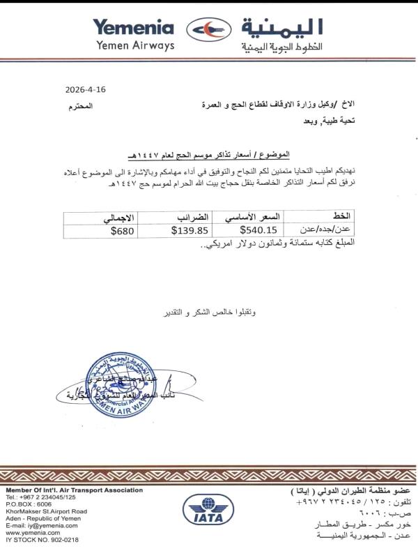 أقرت شركة الخطوط الجوية اليمنية، خلال اجتماعها في العاصمة المؤقتة عدن برئاسة رئيس مجلس الإدارة الكابتن ناصر محمود، تخفيض أسعار تذاكر الحجاج لموسم حج هذا العام 1447هـ، مقارنة بأسعار الموسم الماضي، حيث تم اعتماد السعر الجديد بمبلغ 680 دولاراً أمريكيا.