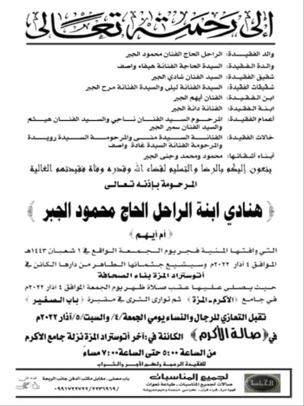 نعت الفنانة السورية دانة جبر والدتها هنادي جبر وذلك عبر حسابها الرسمي على موقع التواصل الاجتماعي "فيسبوك".